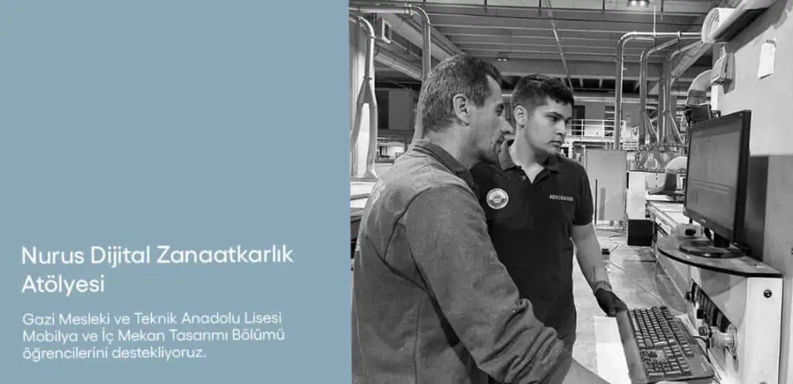Nurus olarak, gençlerin yaratıcılıklarını ortaya koymalarını ve geleceklerini inşa etmelerini desteklemek bizim için çok önemli. Bu nedenle başlattığımız “Dijital Zanaatkar Eğitim Atölyesi” ile lise öğrencilerine, en son dijital teknolojileri kullanarak tasarım yapma fırsatı sunuyoruz. Arge Merkezimizin kendi geliştirdiği son teknoloji ahşap CNC makinesi ile öğrencilerin mesleki becerilerini geliştirmelerine katkı sağlıyoruz.